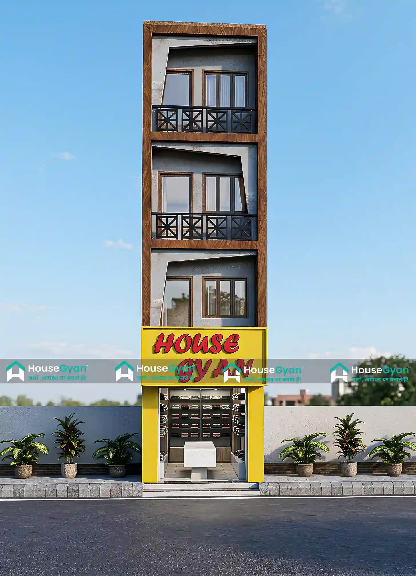 The bold yellow shopfront on the ground floor adds visibility and gives the retail entrance an attractive commercial presence. Angled wall cutouts bring a modern design touch, while the aluminium sliding windows and geometric MS railings enhance both function and style.