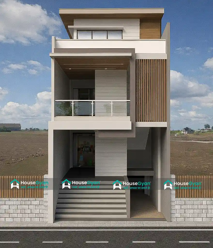 This 20x40 G+1 minimal modern house elevation features a clean box-style design with off-white and light grey tones, enhanced by natural wooden finishes. Vertical wooden slat cladding, glass balcony railing, and layered projections give the façade a premium urban look.