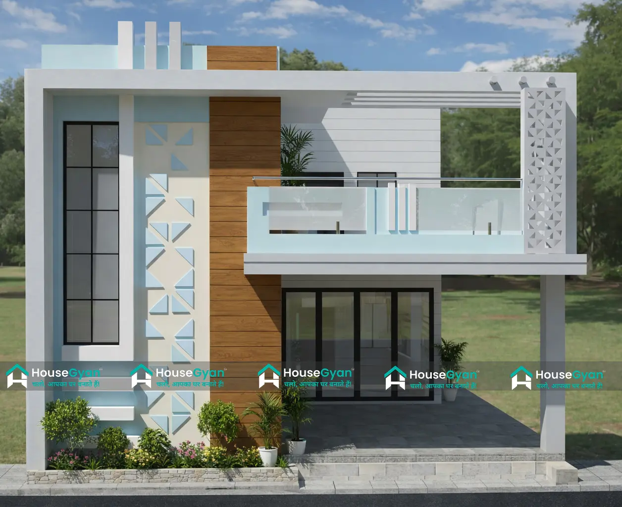 This 26×40 ground-floor modern house elevation features a clean and contemporary façade designed with soft, soothing colors and sharp geometric detailing. The combination of white and sky blue tones creates a fresh look, while the vertical wooden panel adds warmth and a premium feel to the overall design.