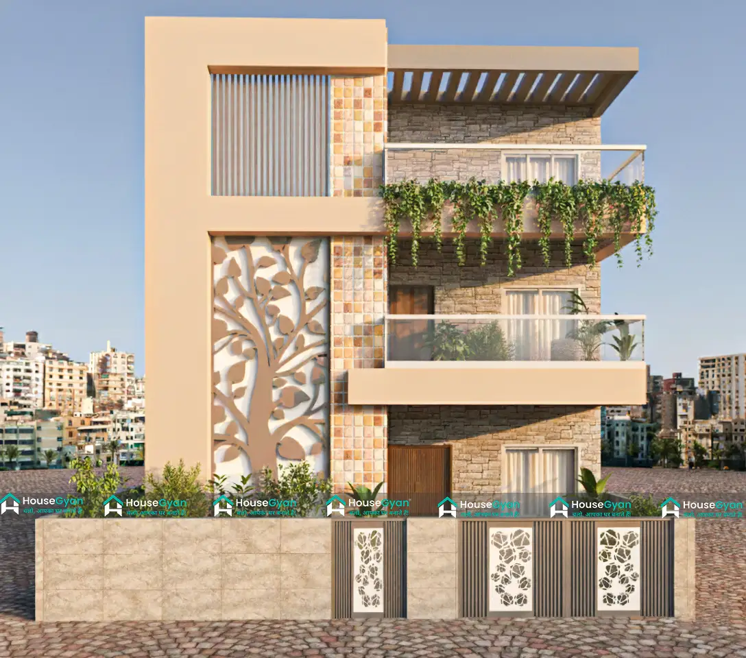 The tall tree-pattern jaali panel adds a sculptural presence, while the soft beige framing brings balance and warmth. Lush balcony planters spill over the glass railings, giving the home a gentle, garden-like aura. The patterned boundary gate completes the look with clean geometry and subtle detailing. A beautifully curated elevation for homeowners who want nature, style, and sophistication woven into their front view.