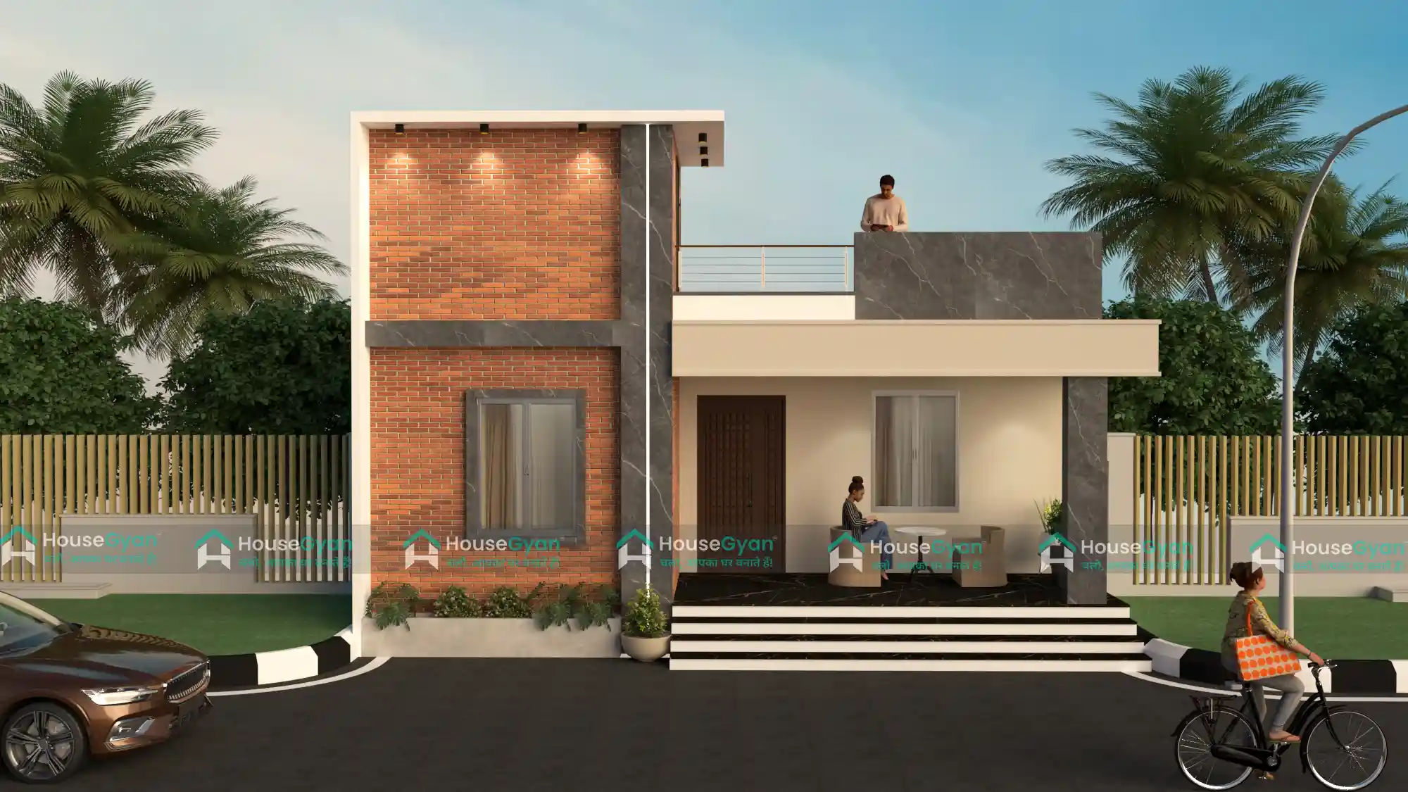 This modern 30x50 elevation brings together the warmth of exposed brick and the bold elegance of dark marble textures.