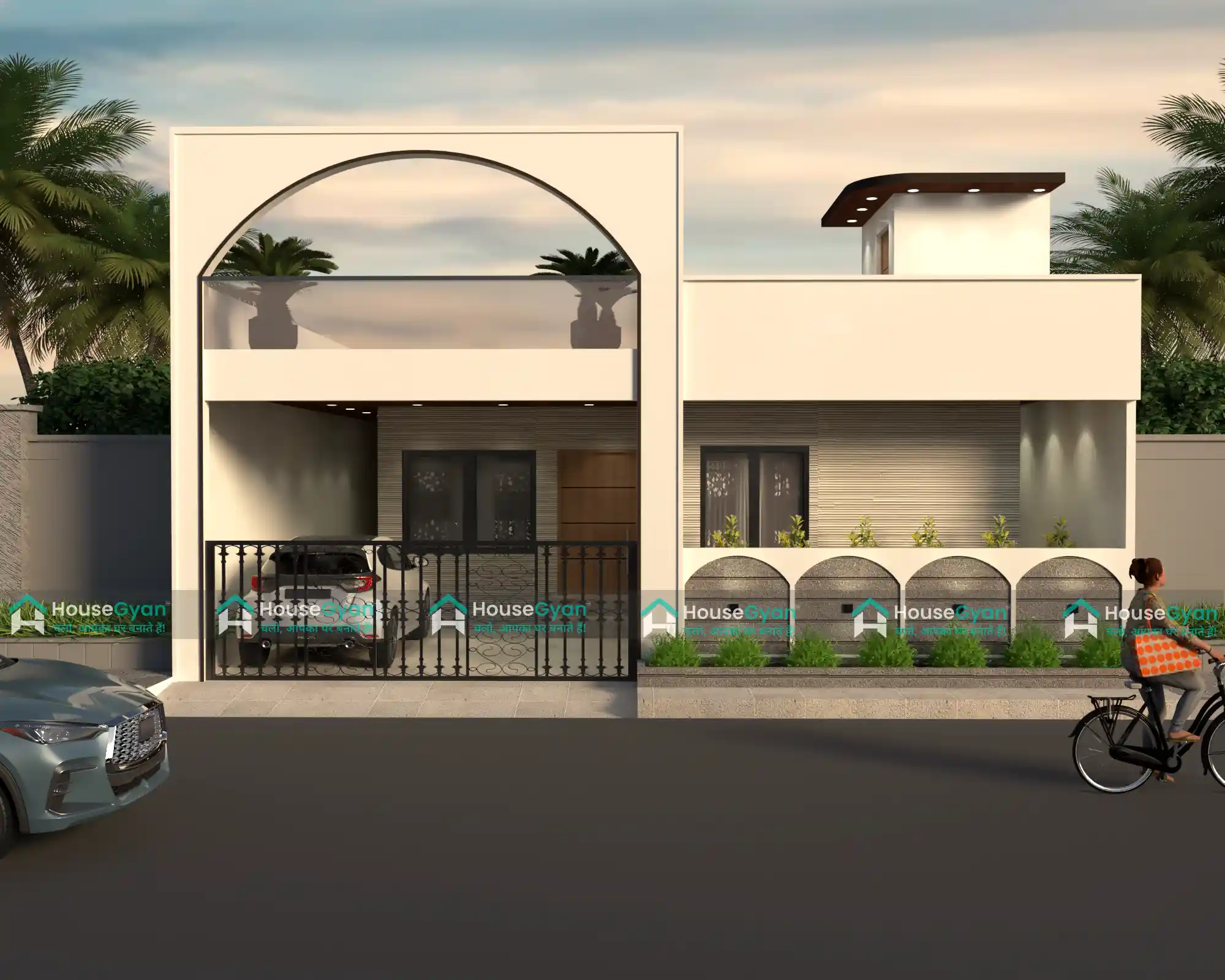 This 35×51 modern contemporary house elevation showcases a sleek arched design that creates a strong visual identity. Finished in Cloud Dancer (Pantone Color of the Year), the façade feels light, elegant, and timeless. The extended arched terrace with glass railing and MS supports adds openness and sophistication, while the flat roof keeps the design clean and modern.