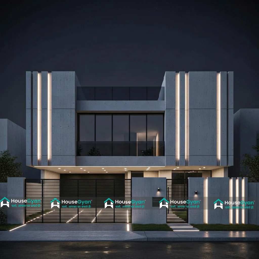 A bold and luxurious duplex house designed in contemporary style, featuring clean geometric lines, expansive glass panels, and ambient LED facade lighting.