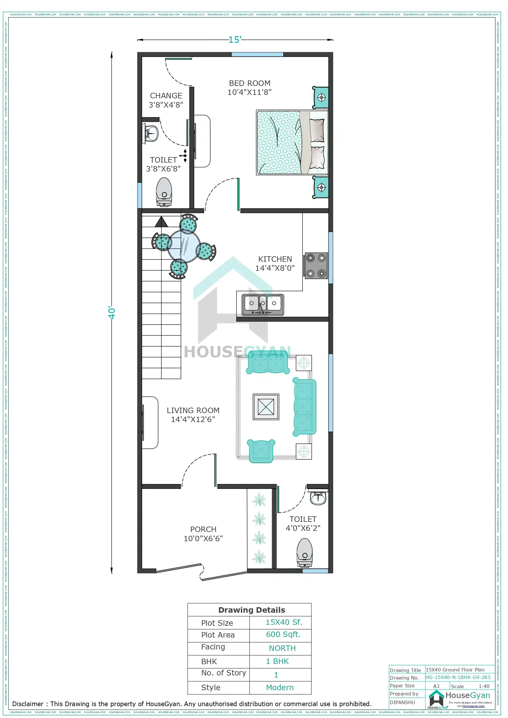 This 15X40 north-facing 1BHK ground floor house plan is designed to maximize space efficiently within a 600 sqft plot. This house plan consists of 1 bedrooms, 1 Hall and 1 bathrooms within 600 square feet. If you're looking for a 15X40 house plan, you've come to the right place. Here at HouseGyan architects, we specialize in designing and creating floor plans for all types of 15X40 plot size houses. Whether you're looking for a traditional multi stories home or a more modern ranch-style home, we can help you create the perfect 15*40 floor plan for your needs.