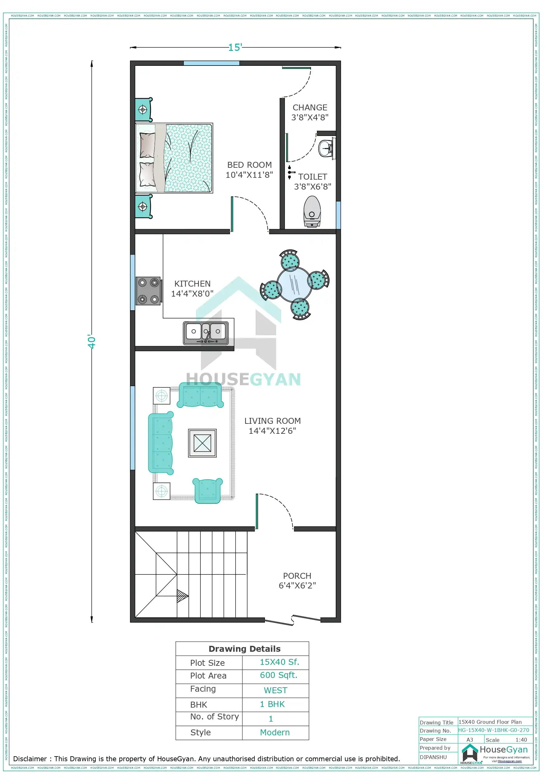 This 15X40 west-facing 1BHK ground floor house plan is designed to maximize space efficiently within a 600 sqft plot. This house plan consists of 1 bedrooms, 1 Hall and 1 bathrooms within 600 square feet. If you're looking for a 15X40 house plan, you've come to the right place. Here at HouseGyan architects, we specialize in designing and creating floor plans for all types of 15X40 plot size houses. Whether you're looking for a traditional multi stories home or a more modern ranch-style home, we can help you create the perfect 15*40 floor plan for your needs.