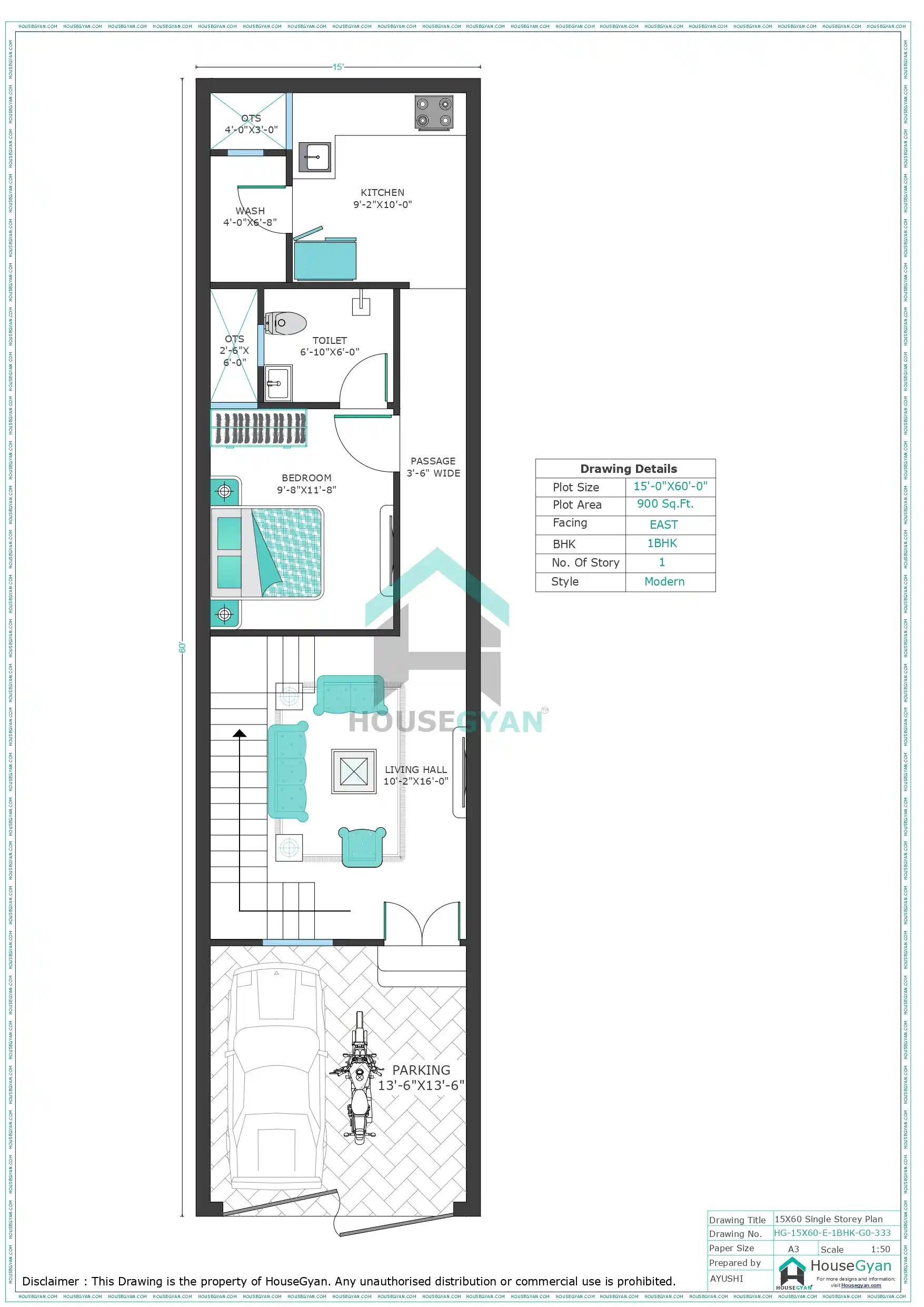 This 15X60 East-facing 1BHK ground floor house plan is designed to maximize space efficiently within a 900 sqft plot. This house plan consists of 1 bedrooms, 1 Hall and 1 bathrooms within 900 square feet. If you're looking for a 15X60 house plan, you've come to the right place. Here at HouseGyan architects, we specialize in designing and creating floor plans for all types of 15X60 plot size houses. Whether you're looking for a traditional single-story home or a more modern ranch-style home, we can help you create the perfect 15*60 floor plan for your needs.