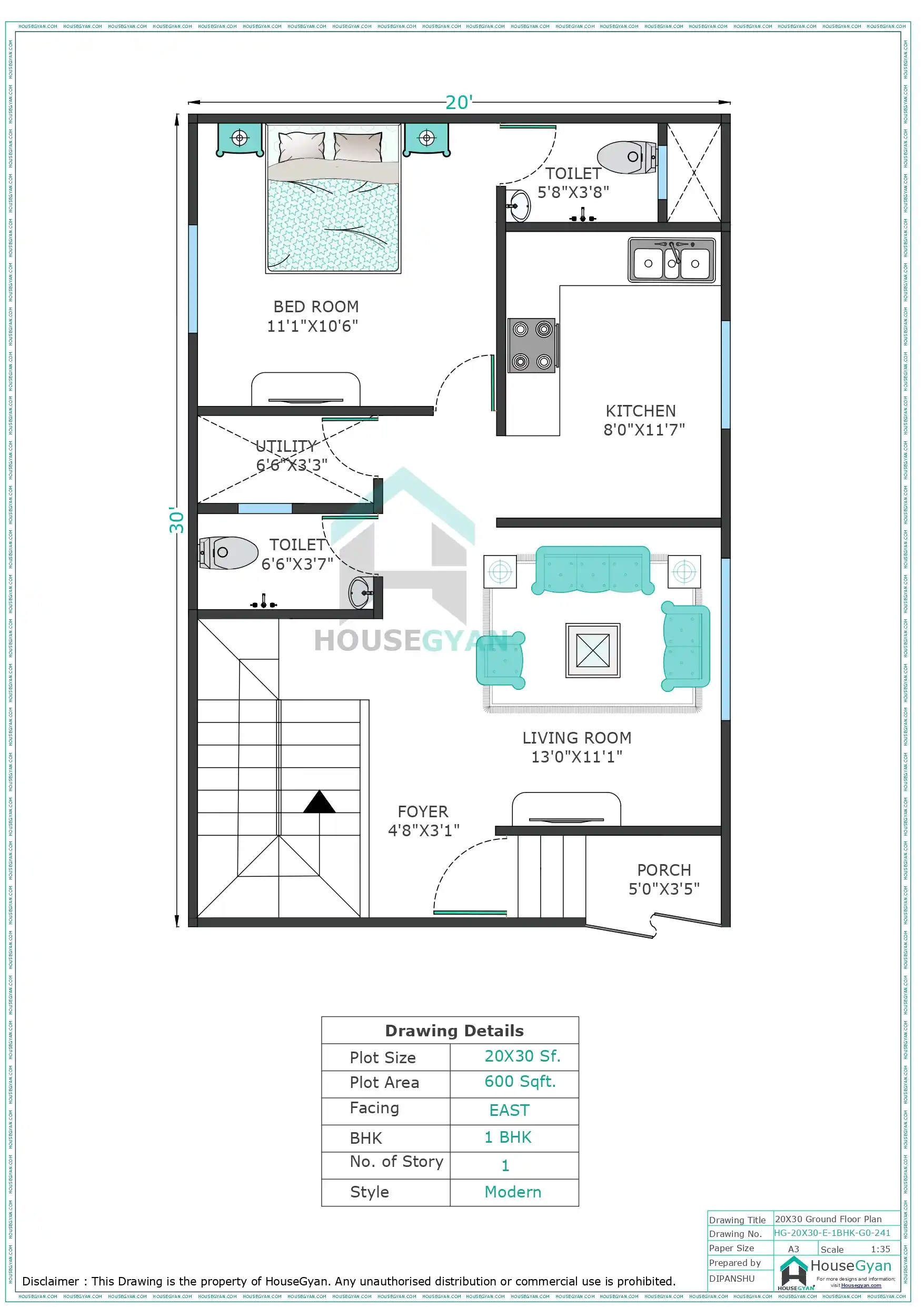 This 20X30 east-facing 1BHK ground floor house plan is designed to maximize space efficiently within a 600 sqft plot. This house plan consists of 1 bedrooms,1 Hall and 1 bathrooms within 600 square feet. If you're looking for a 20X30 house plan, you've come to the right place. Here at HouseGyan architects, we specialize in designing and creating floor plans for all types of 20X30 plot size houses. Whether you're looking for a traditional single-story home or a more modern ranch-style home, we can help you create the perfect 20*30 floor plan for your needs.