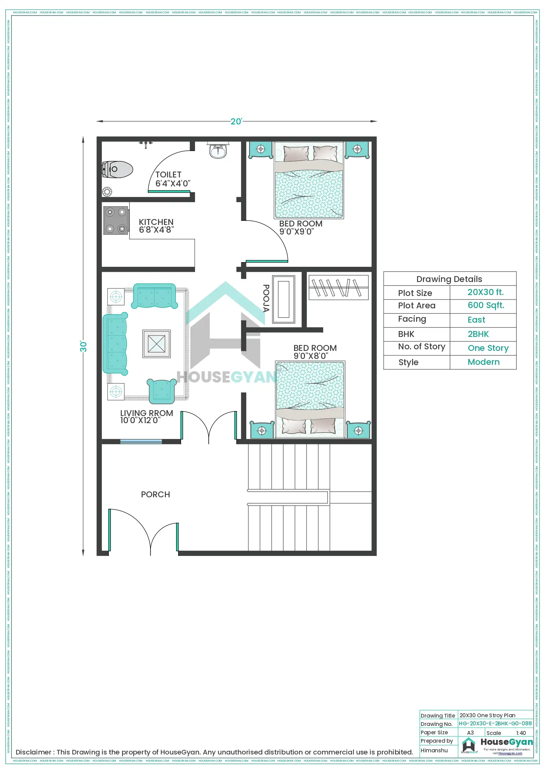 This 20X30 east-facing 2BHK ground floor house plan is designed to maximize space efficiently within a 600 sqft plot. This house plan consists of 2 bedrooms, 1 Hall and 1 bathrooms within 600 square feet. If you're looking for a 20X30 house plan, you've come to the right place. Here at HouseGyan architects, we specialize in designing and creating floor plans for all types of 20X30 plot size houses. Whether you're looking for a traditional multi stories home or a more modern ranch-style home, we can help you create the perfect 20*30 floor plan for your needs.