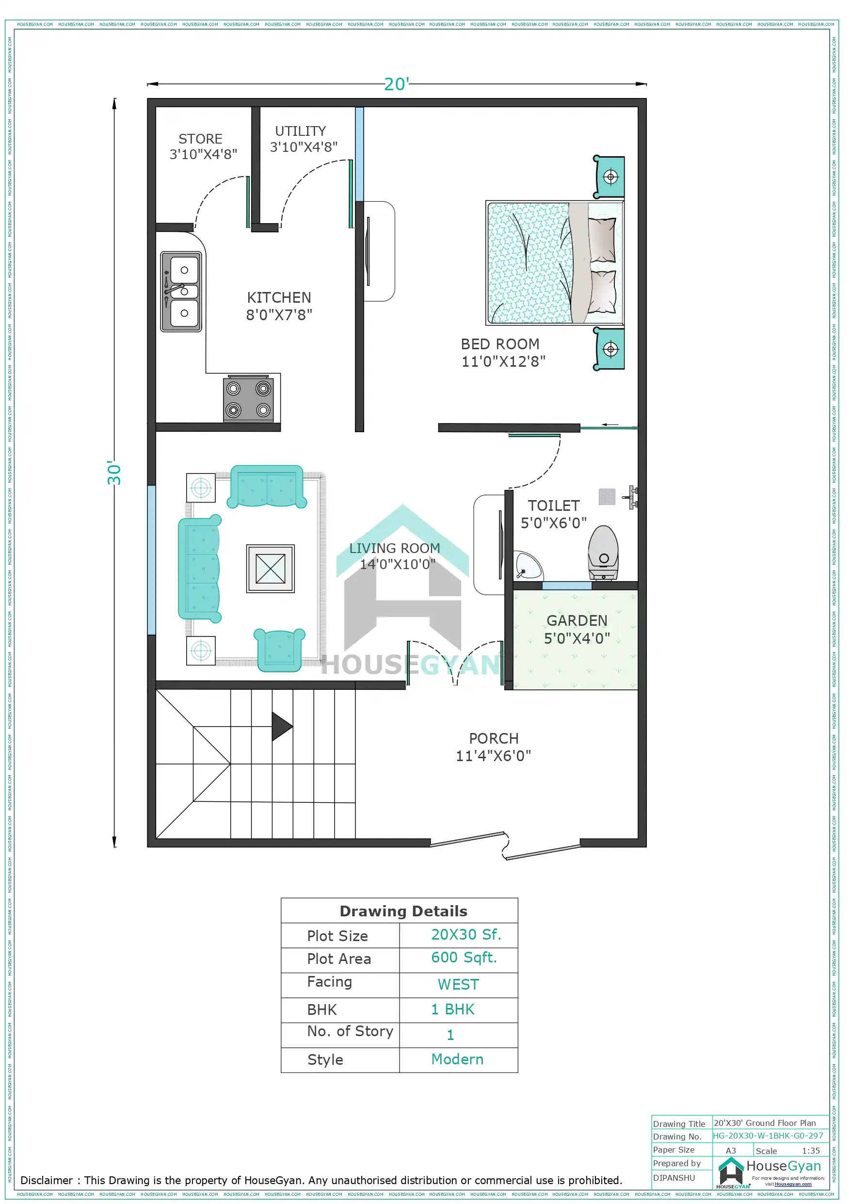 This 20X30 West Facing 1BHK Ground Floor House Plan on a 600 sq ft plot is a perfect solution for compact living with modern comforts. Featuring a porch, garden, store, utility area, and staircase, it offers a complete and practical home design.