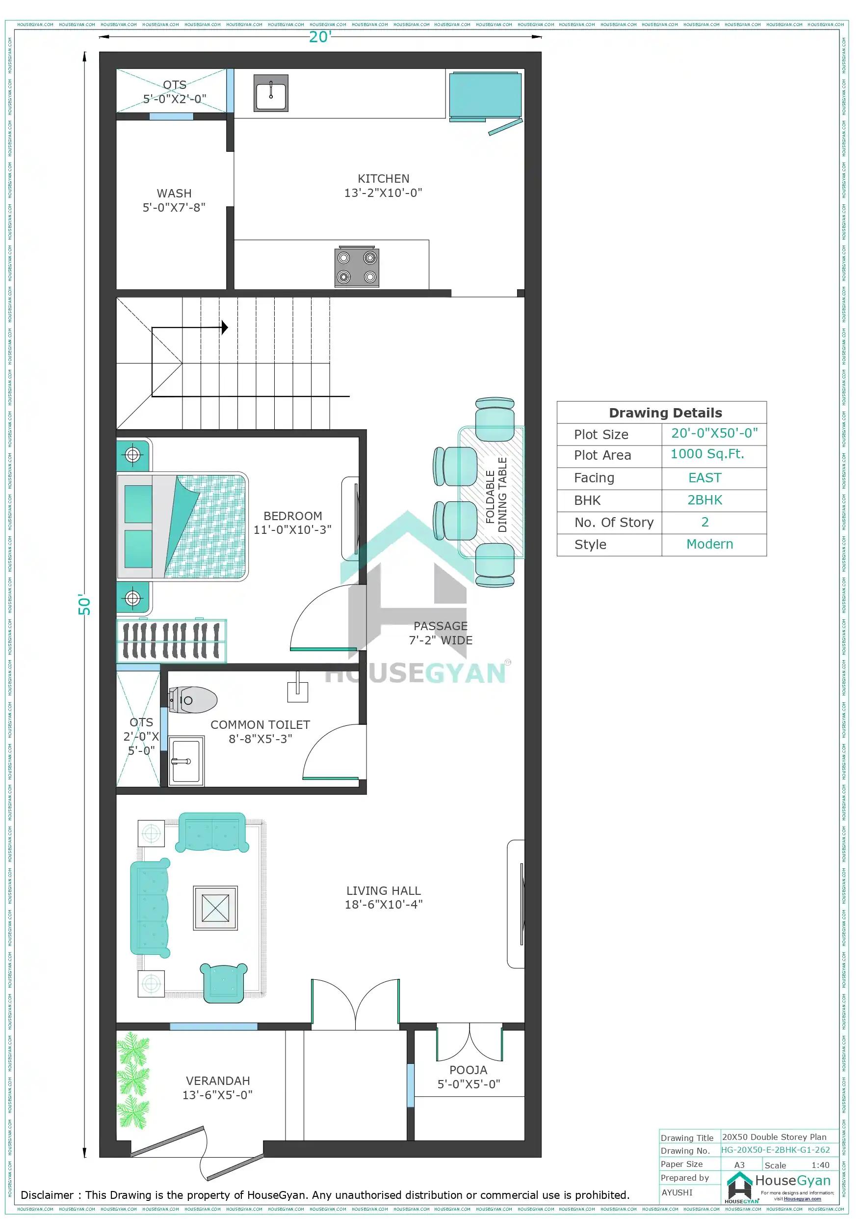 At HouseGyan Architects, we specialize in crafting customized 20x50 house plans that suit your lifestyle and preferences. Whether you prefer a traditional multi-storey home or a modern double-floor layout, our team can design the perfect 20x50 floor plan for your needs.