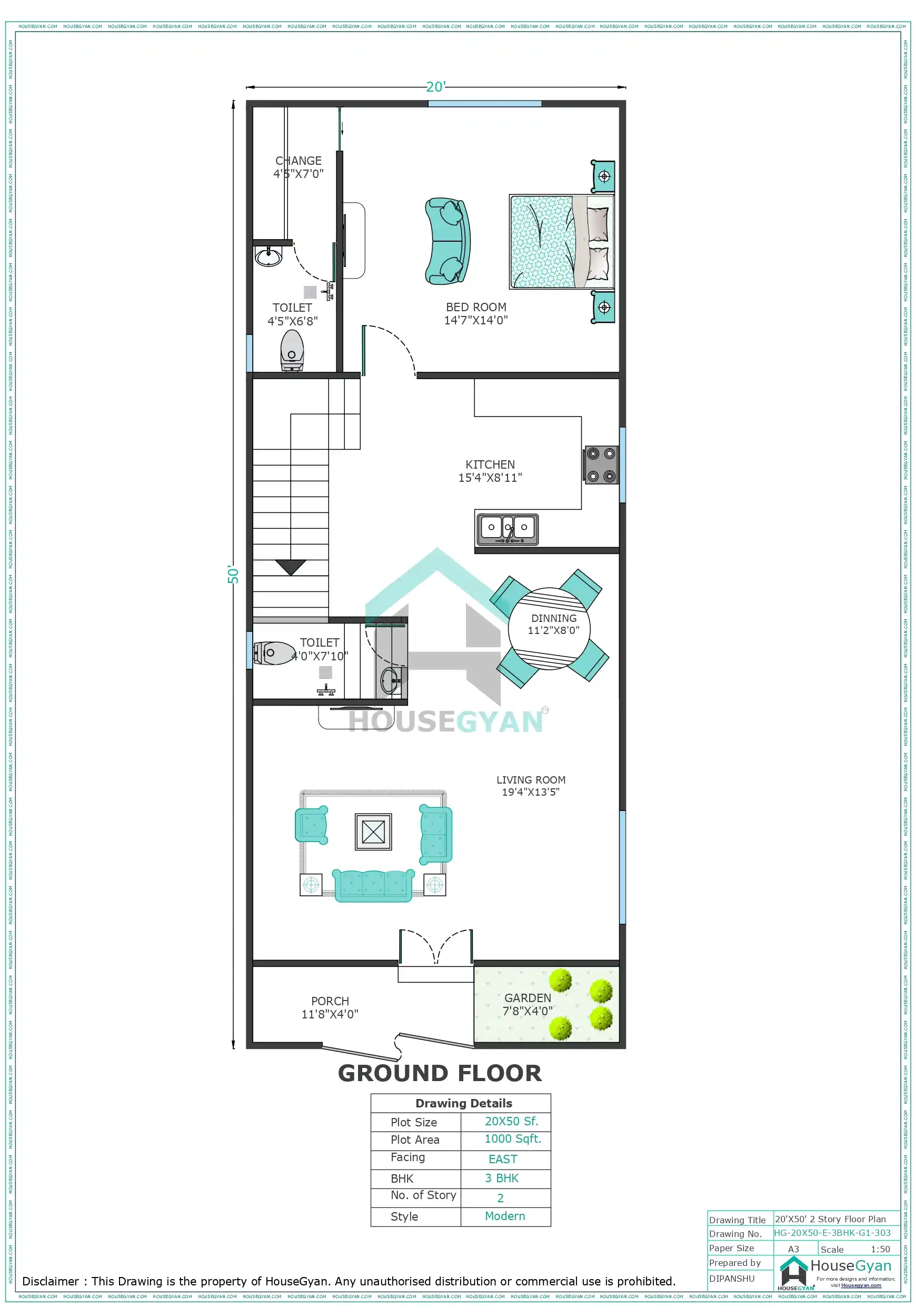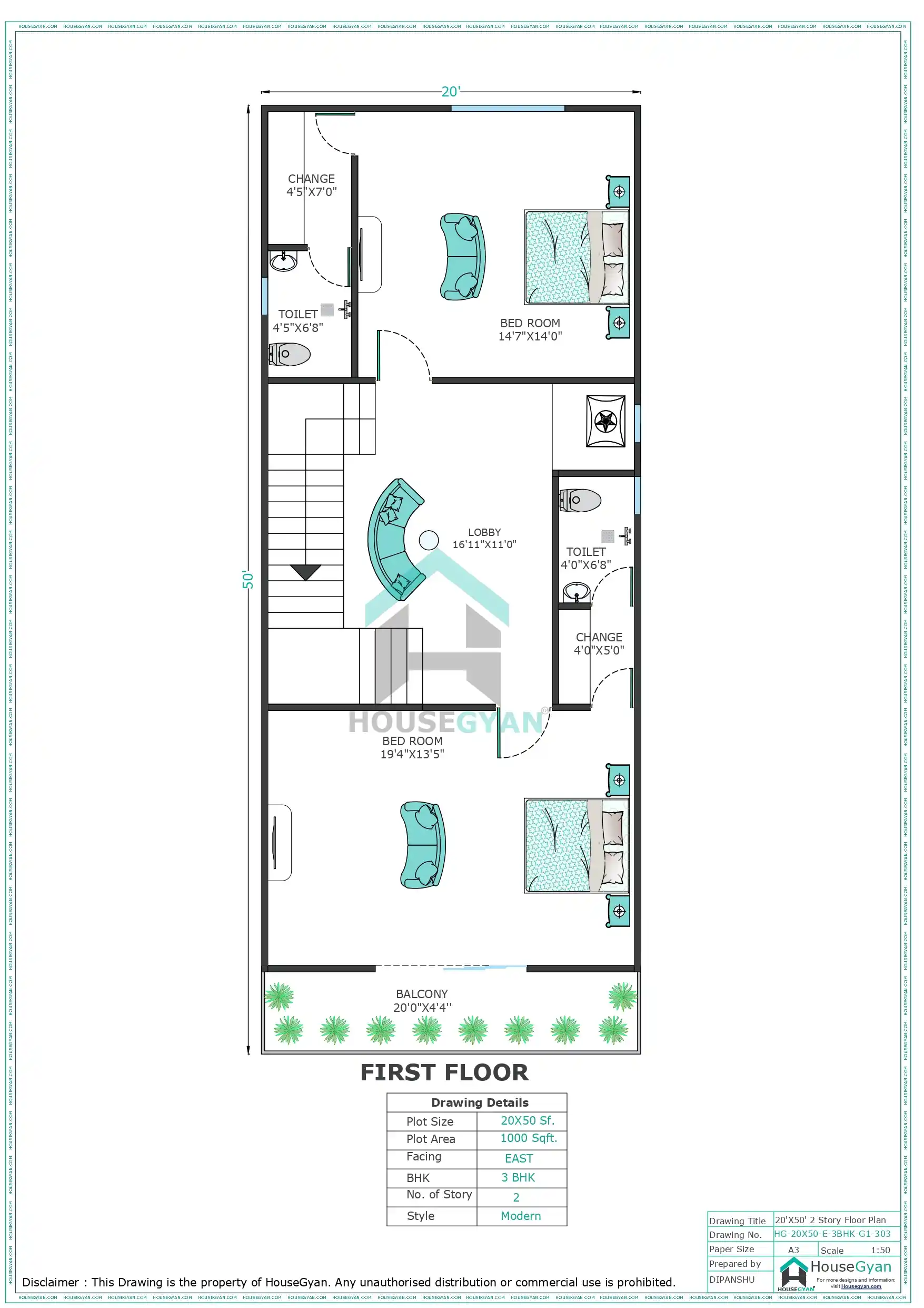 This 20X50 East Facing 3BHK First Floor House Plan on a 1000 sq ft plot offers a perfect mix of comfort, functionality, and modern design. With features like change rooms, balcony, pooja space, lobby, and garden, it is an ideal home for contemporary family living.