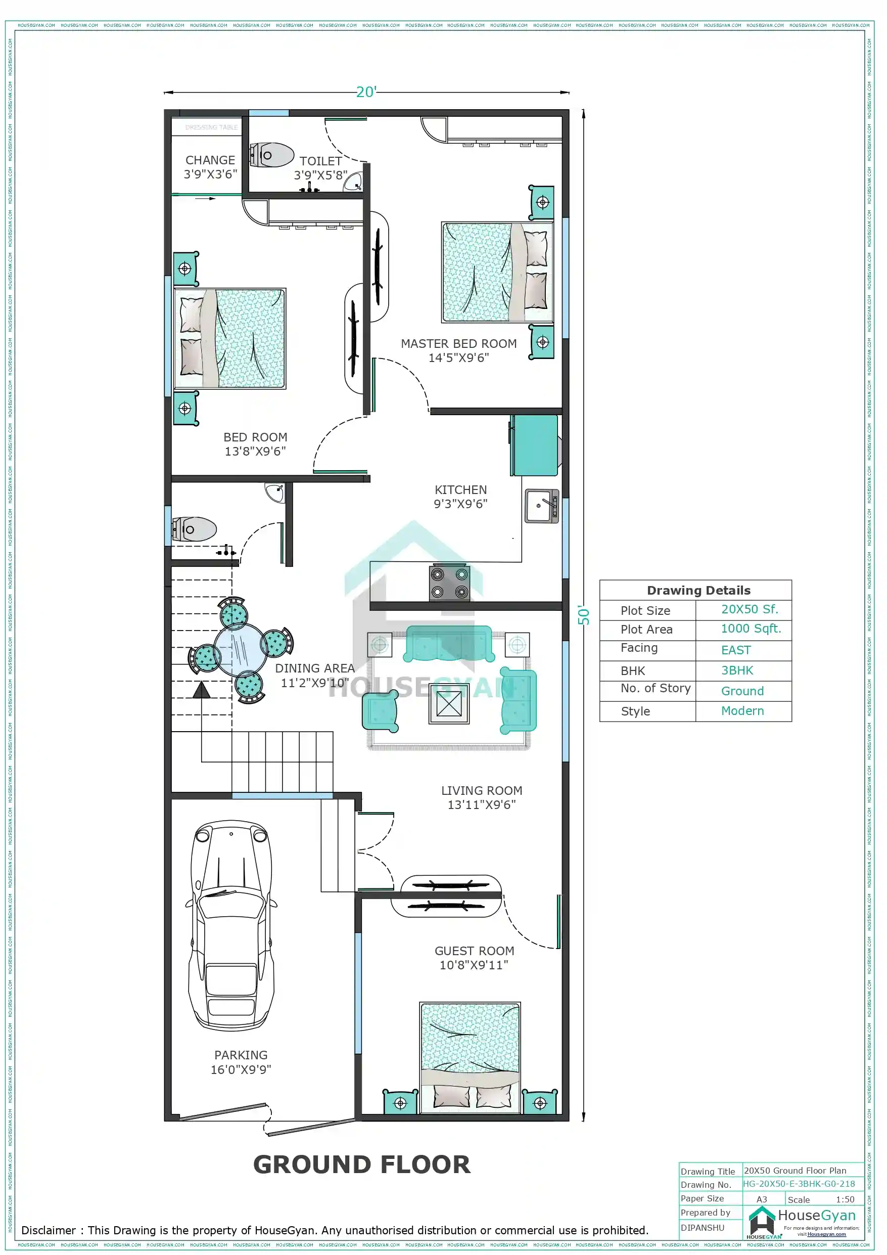 20X50 East Facing 3BHK Ground Floor House Plan | 1000 Sqft Plot Floor Plan