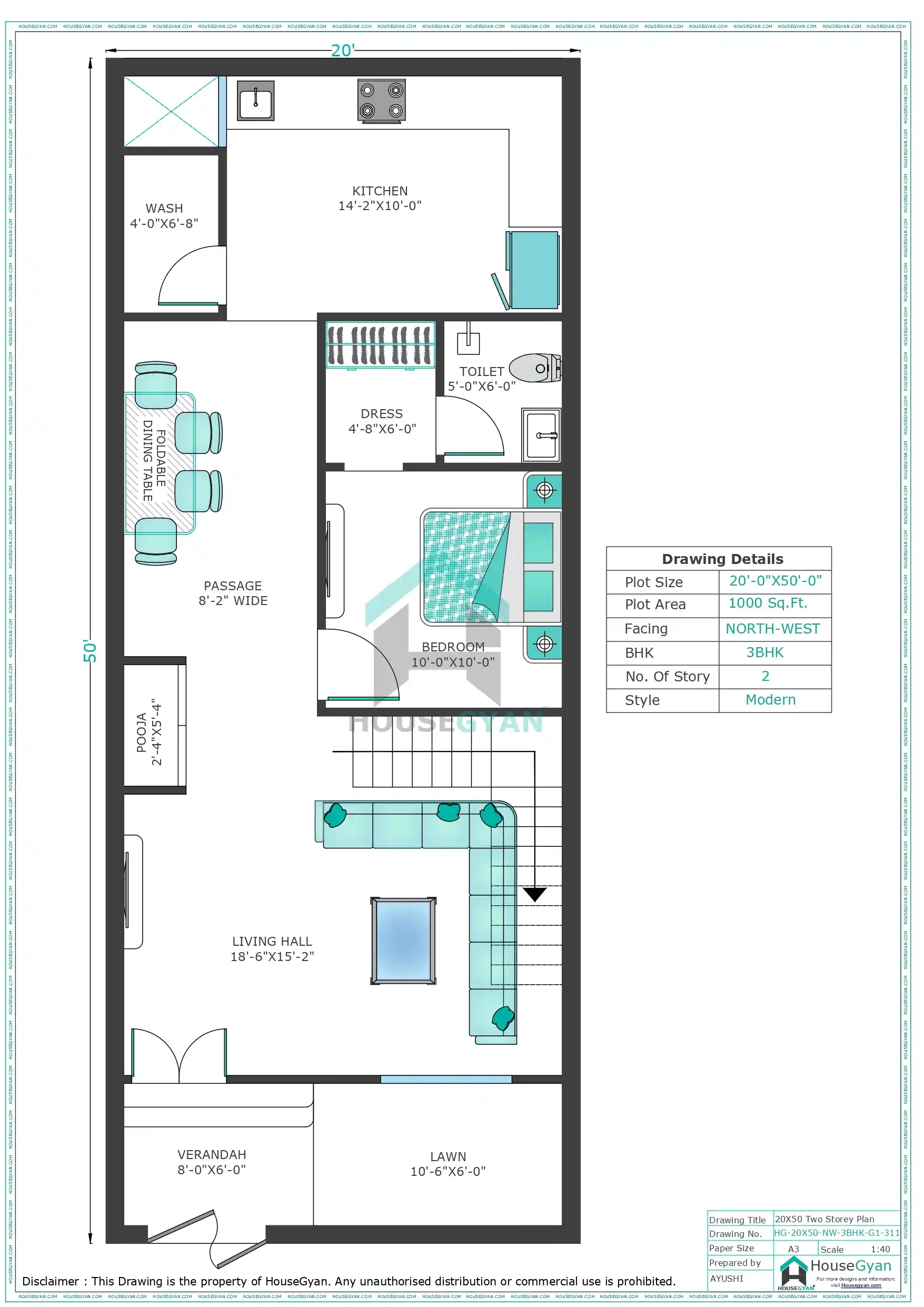 This 20X50 North West Facing 3BHK First Floor House Plan on a 1000 sq ft plot offers a comfortable and stylish living experience. With features like lawn, verandah, lounge, balcony, and pooja room, it is a great choice for modern families.