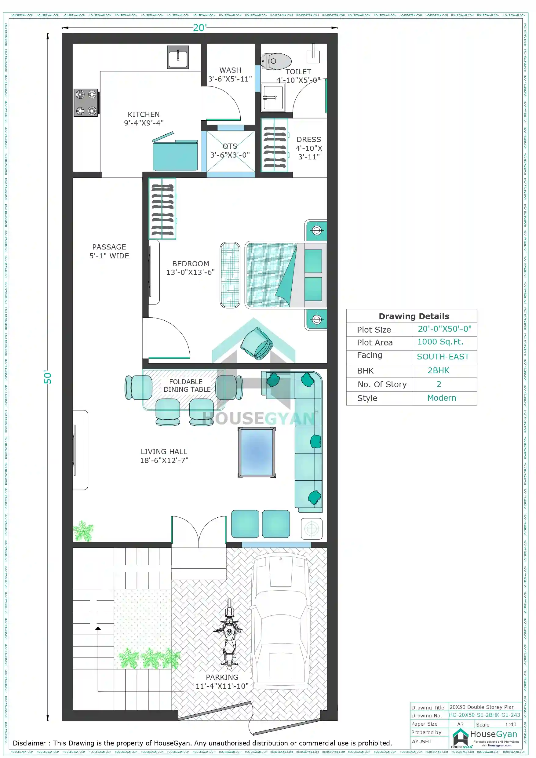 Explore more 20X50 house plans and custom 2BHK home drawings exclusively at HouseGyan!