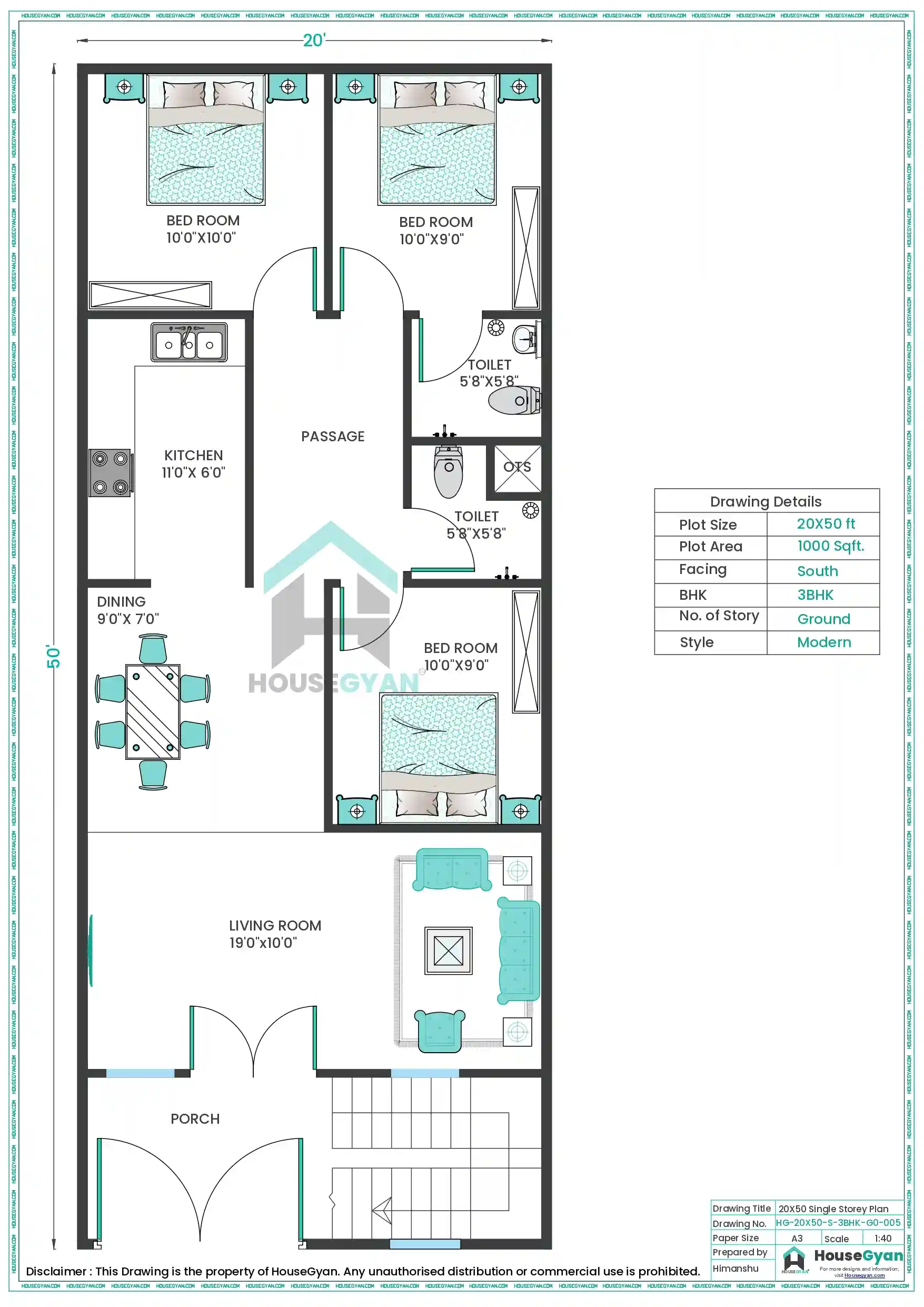 20X50 South Facing 3BHK Ground Floor House Plan | 1000 Sqft Plot Floor Plan