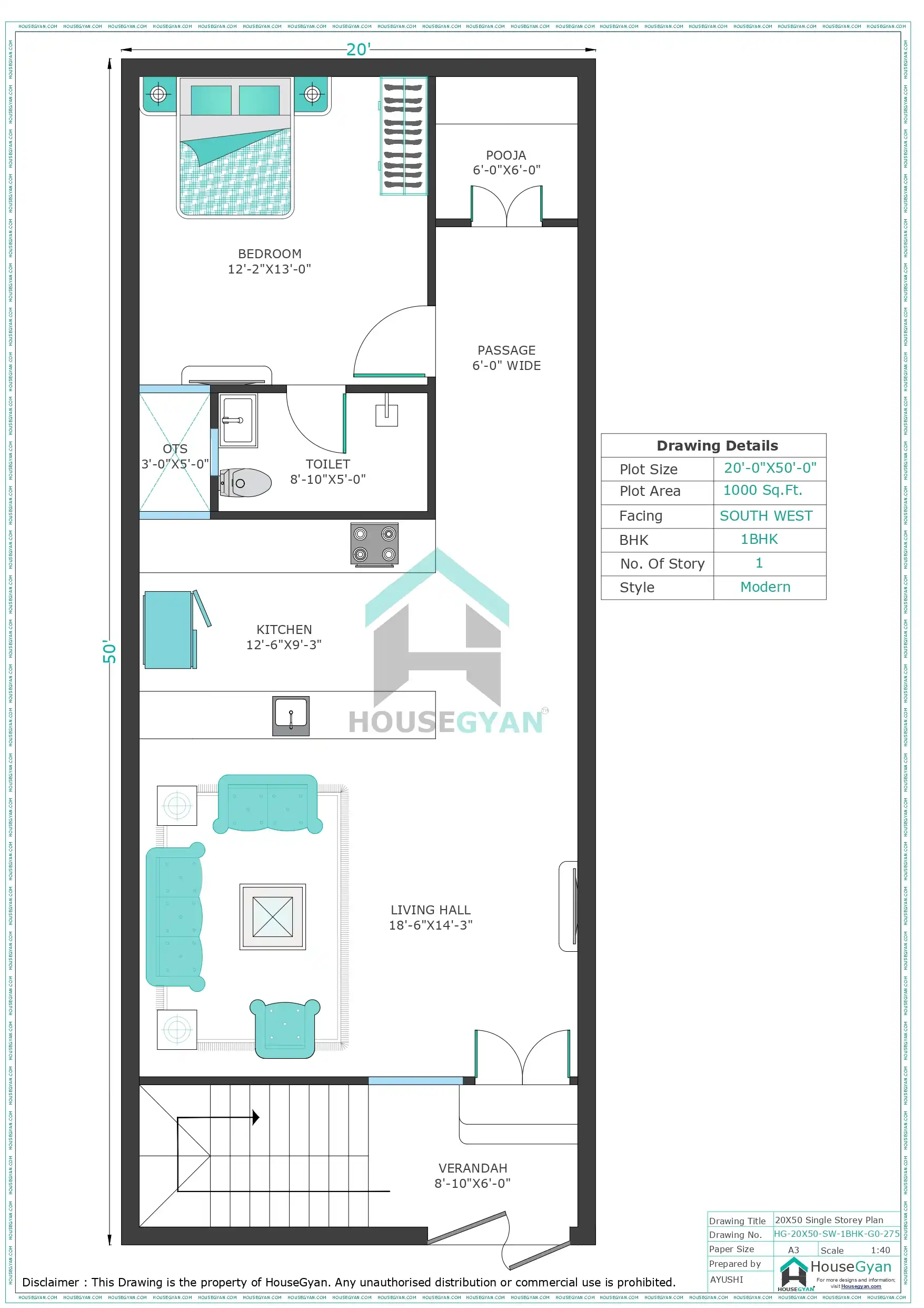 Loading...20X50 House Plan | 1000 Sqft Plot House Plan | 1BHK South West Facing Ground Floor Plan