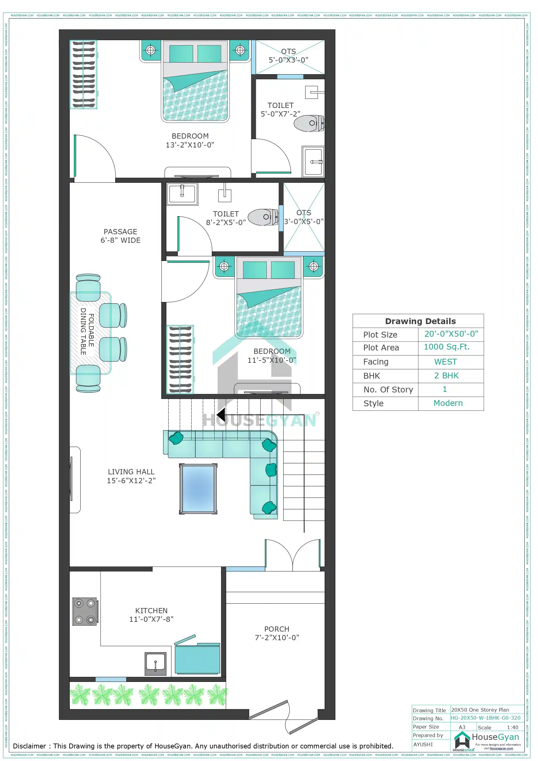 This 20X50 West Facing 2BHK Ground Floor House Plan on a 1000 sq ft plot is a perfect blend of comfort, practicality, and ventilation. With porch, green area, OTS, and well-defined living spaces, it is a smart choice for modern urban living.
