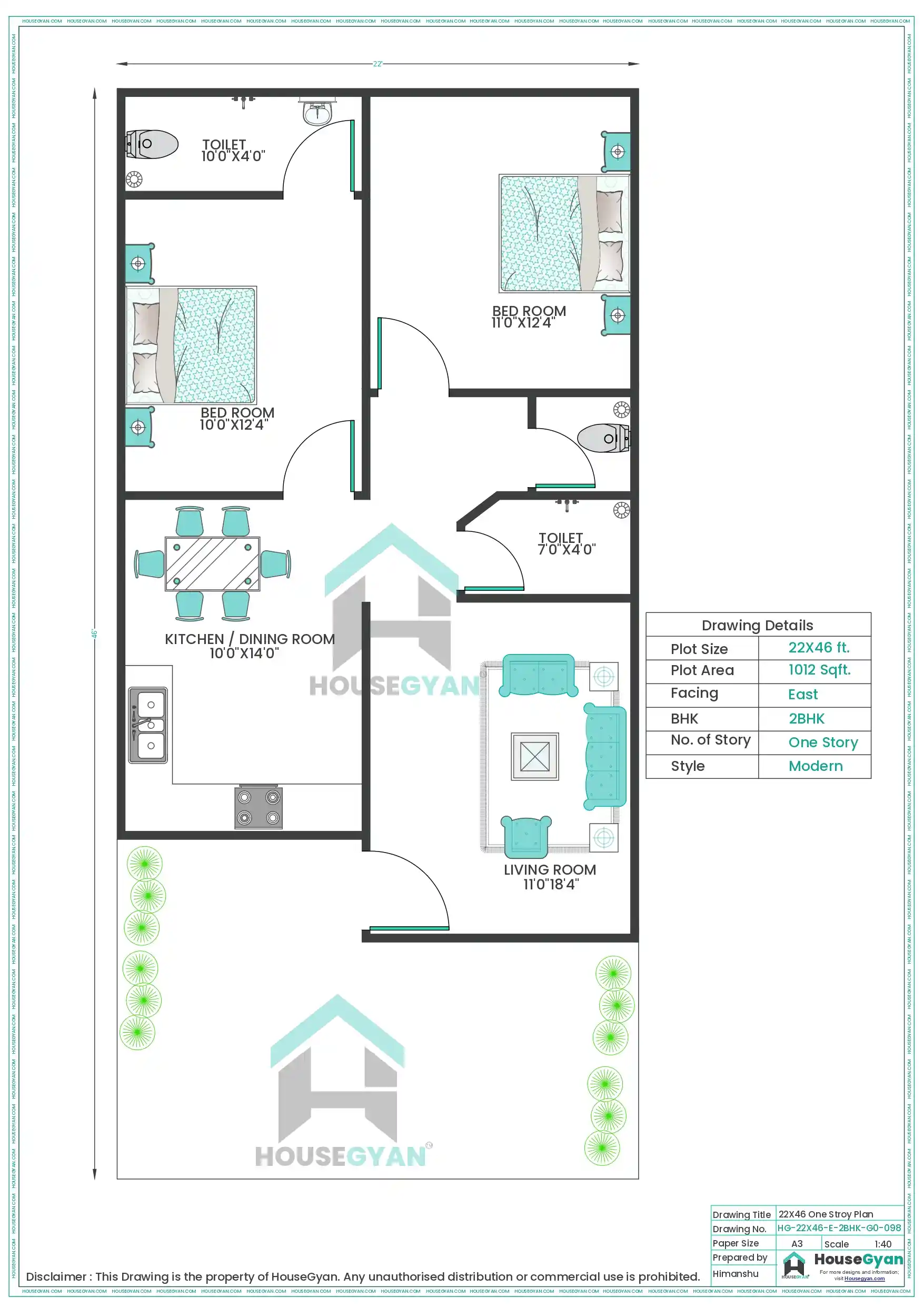 22X46 East Facing 2BHK Ground Floor House Plan | 1012 Sqft Plot Floor Plan