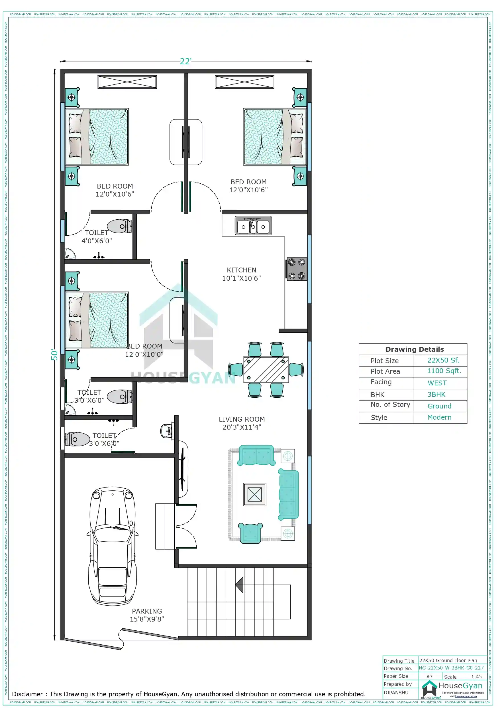 This 22x50 west-facing ground floor plan offers a smart 3BHK layout within 1100 sqft.