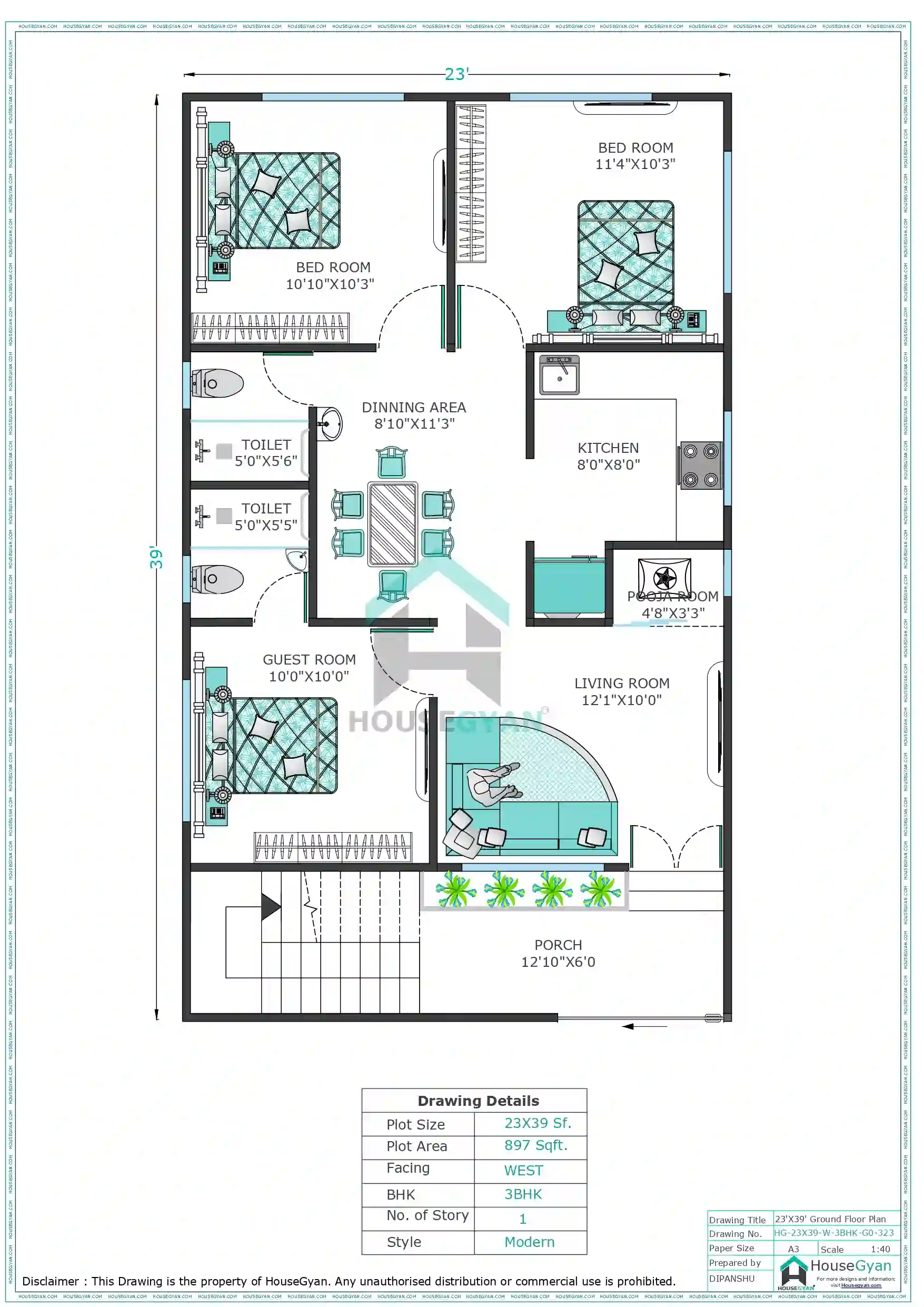 Loading...23X39 West Facing 3BHK Ground Floor House Plan | 897 Sqft Plot Floor Plan