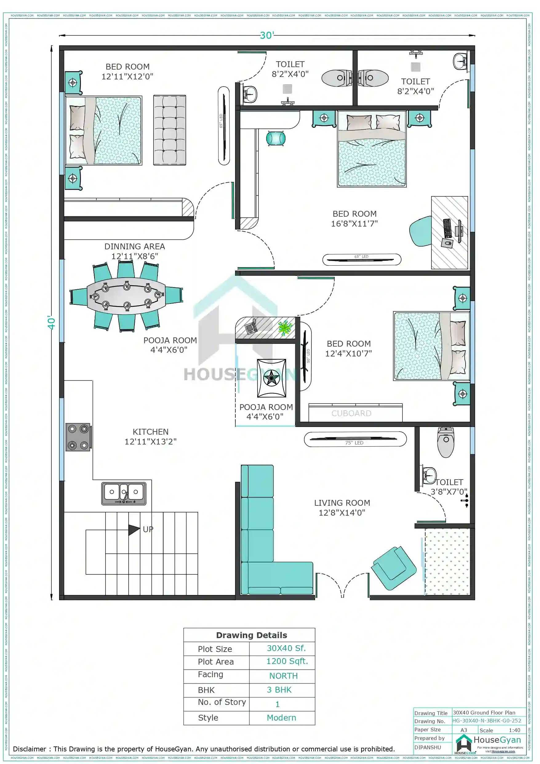 30X40 North Facing 3BHK Ground Floor House Plan | 1200 Sqft Plot Floor Plan
