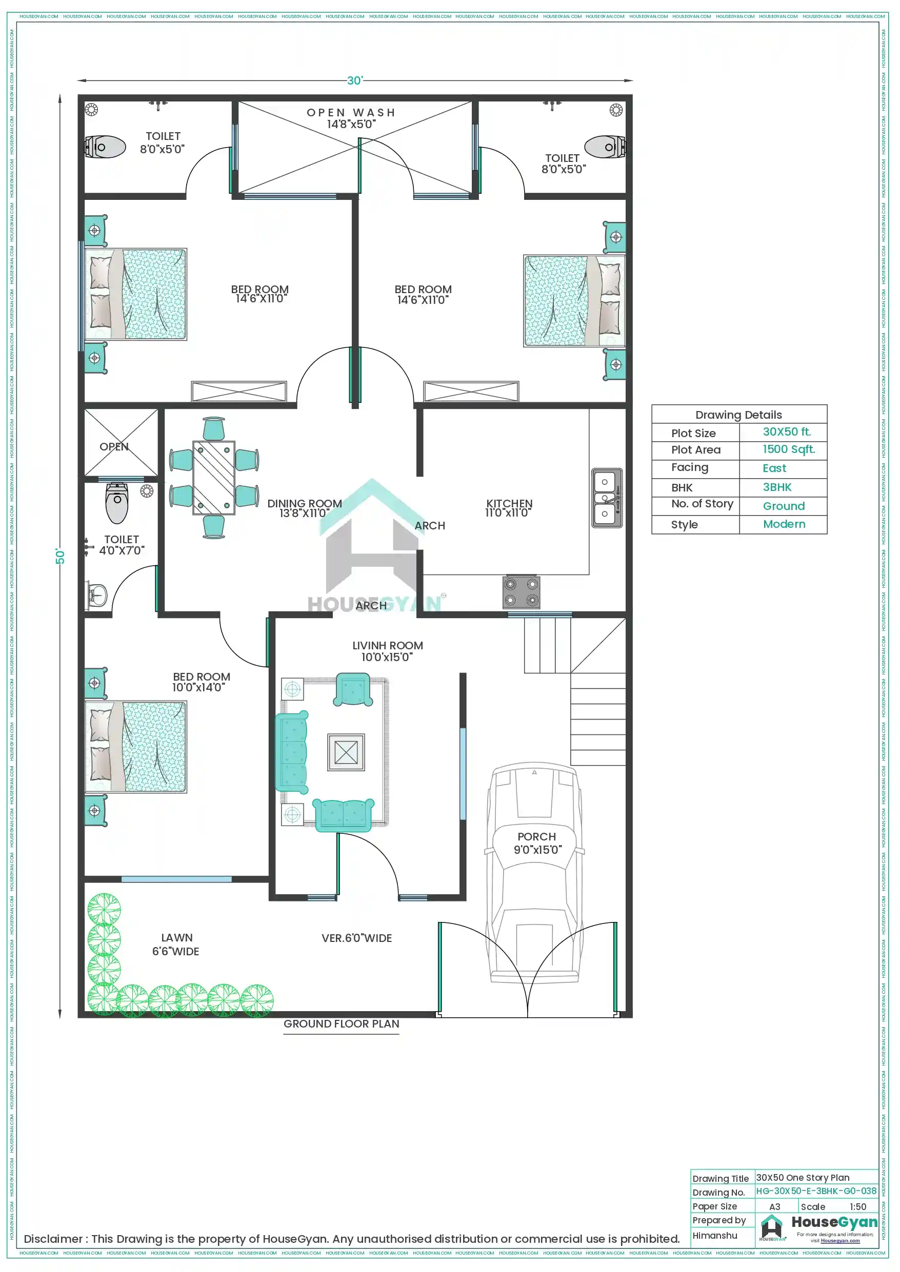 30X50 East Facing 3BHK Ground Floor House Plan | 1500 Sqft Plot Floor Plan