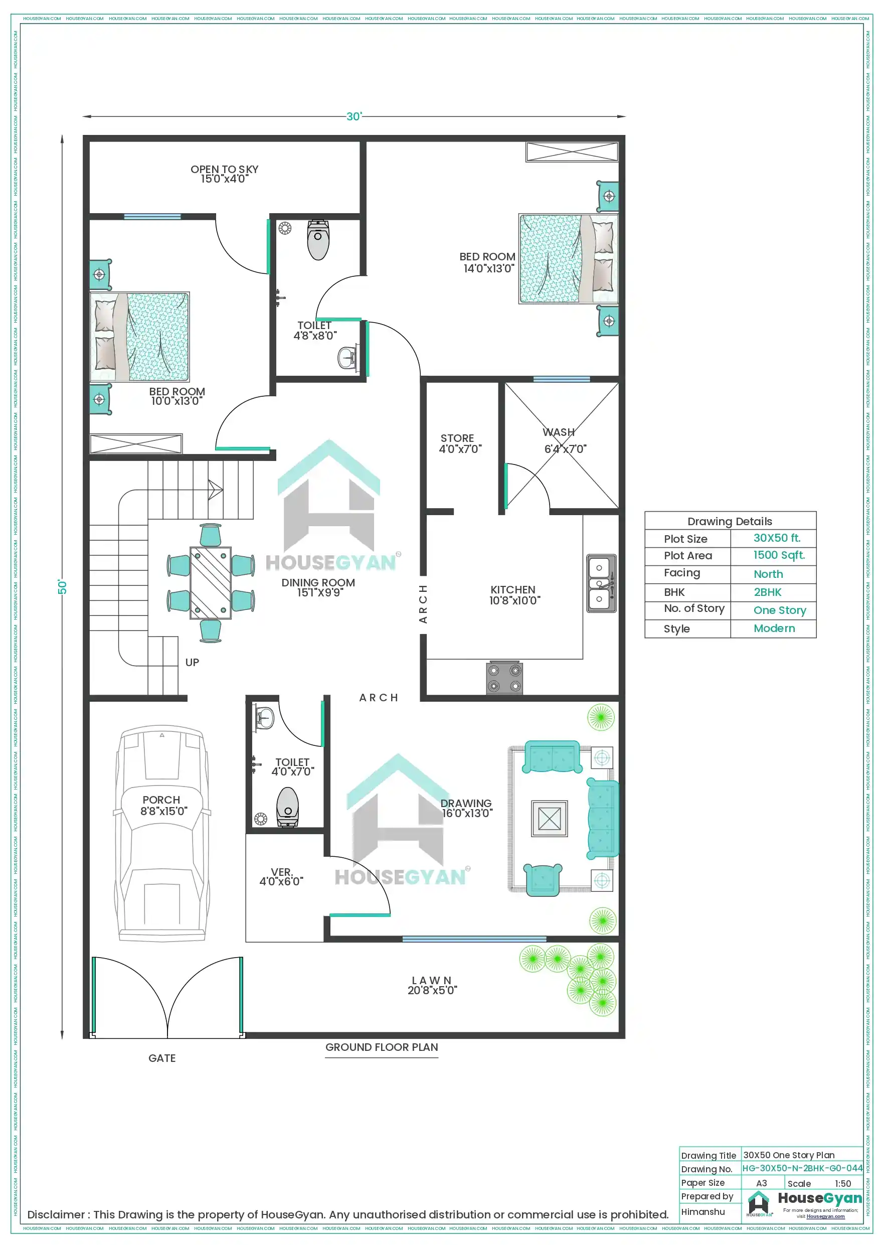 30X50 North Facing 2BHK Ground Floor House Plan | 1500 Sqft Plot Floor Plan