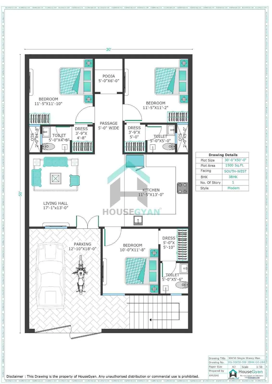 Loading...30X50 House Plan | 1500 Sqft Plot House Plan | 3BHK South West Facing Ground Floor Plan