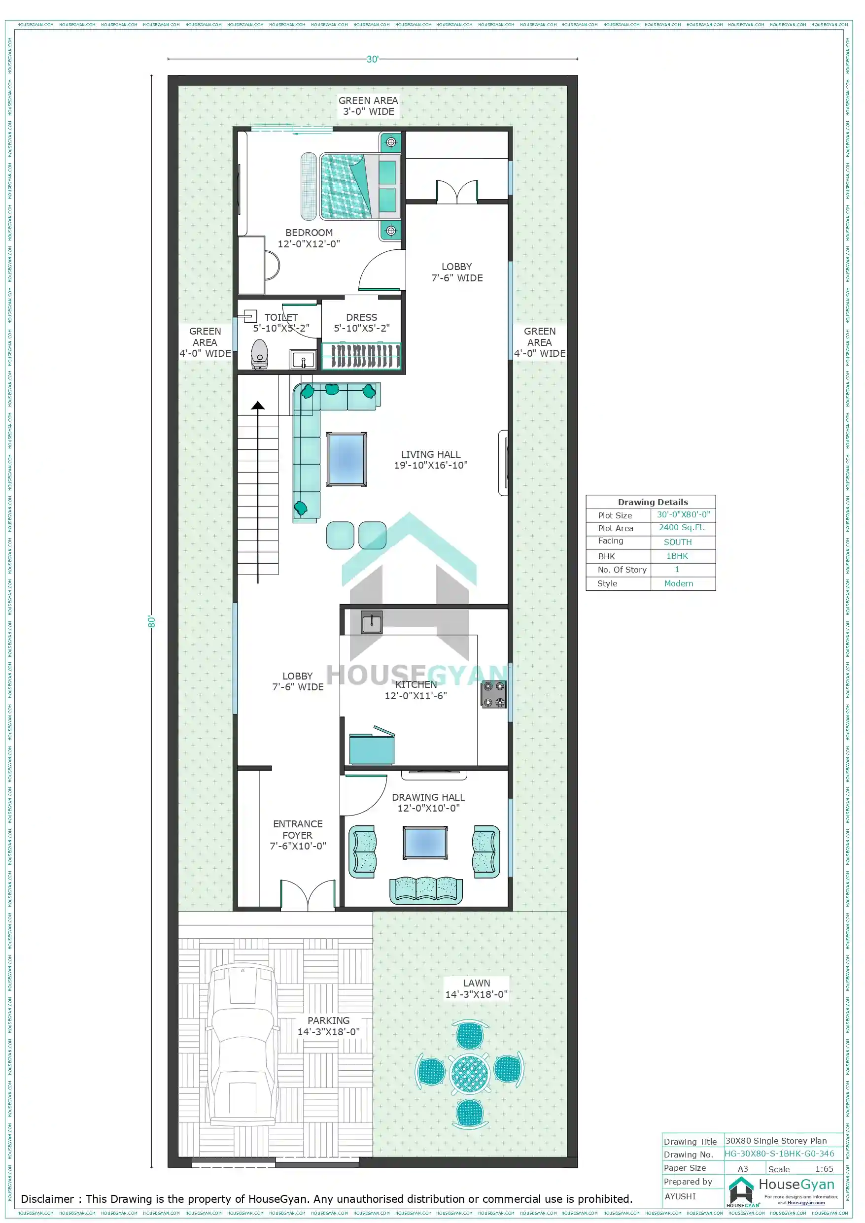 This 30X80 south-facing 1BHK ground floor house plan is designed to maximize space efficiently within a 2400 sqft plot. This house plan consists of 1 bedrooms, 1 Hall and 1 bathrooms within 2400 square feet. If you're looking for a 30X80 house plan, you've come to the right place. Here at HouseGyan architects, we specialize in designing and creating floor plans for all types of 30X80 plot size houses. Whether you're looking for a traditional multi stories home or a more modern ranch-style home, we can help you create the perfect 30*80 floor plan for your needs.