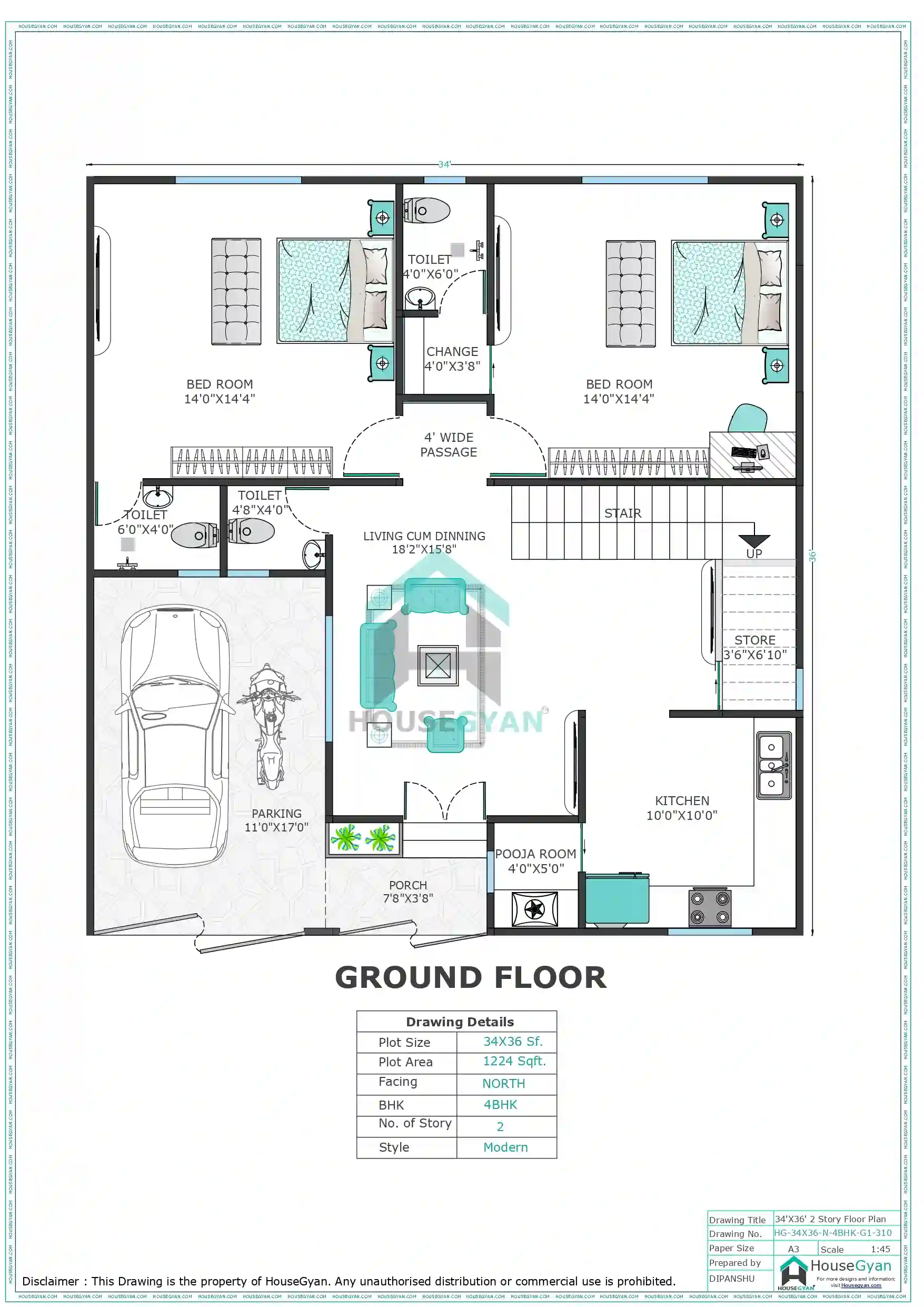 At HouseGyan, you can explore various 34X36 house plan designs, including: