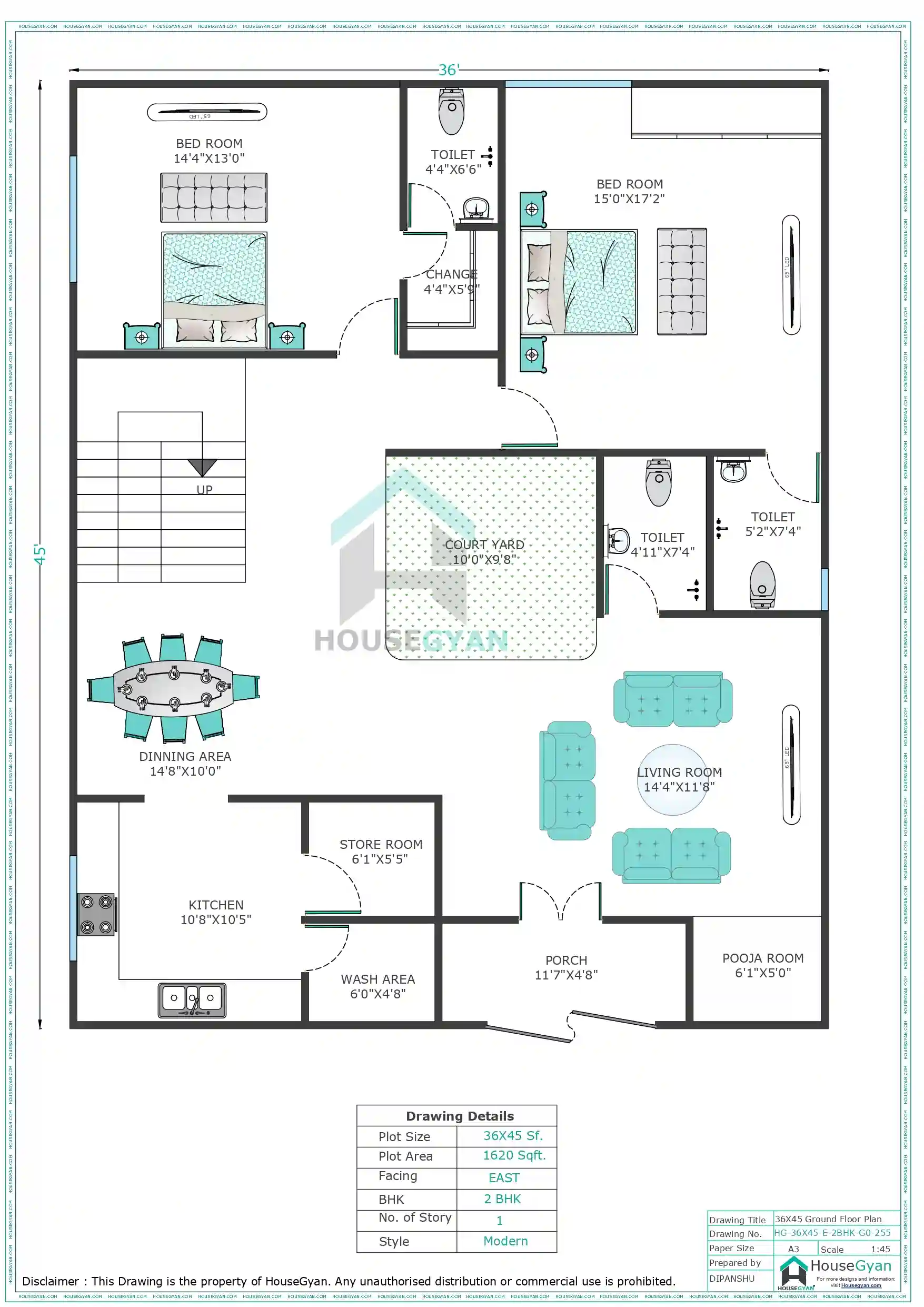 If you prefer a custom-designed 36X45 house plan, HouseGyan provides: