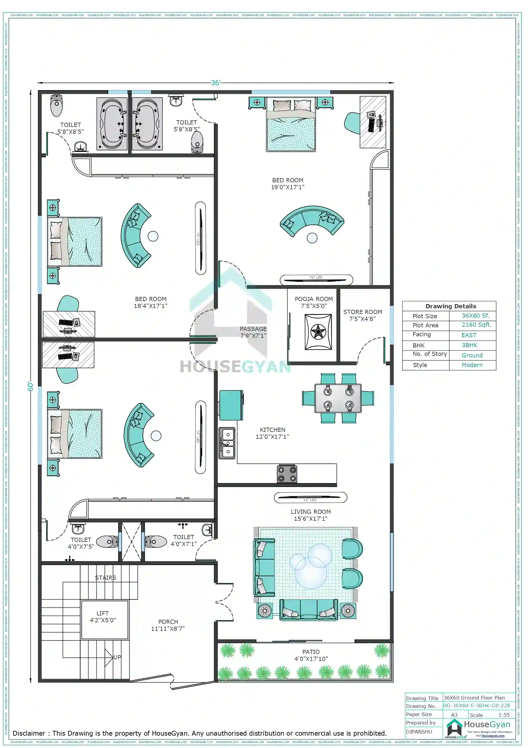 Explore more 36X60 house plans, 3BHK layouts, and custom home drawings only at HouseGyan!