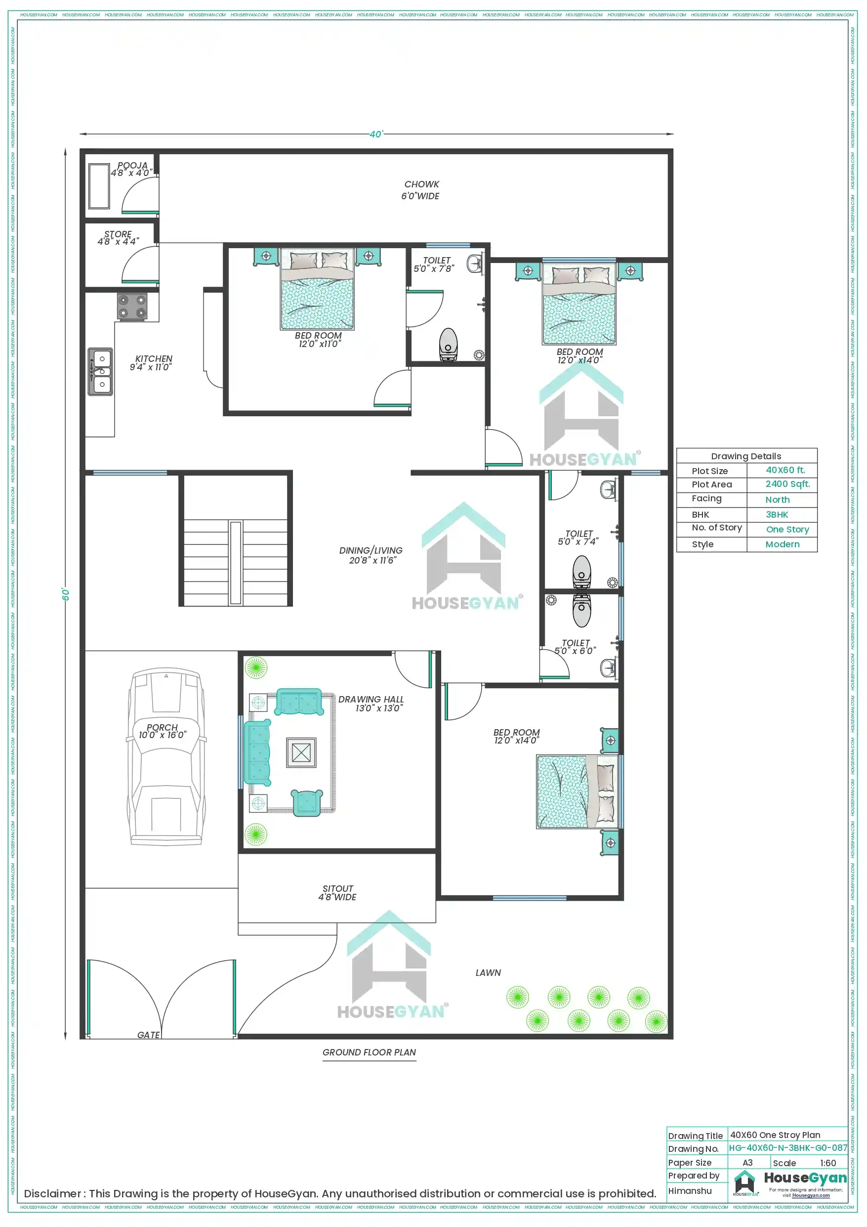 40X60 North Facing 3BHK Ground Floor House Plan | 2400 Sqft Plot Floor Plan