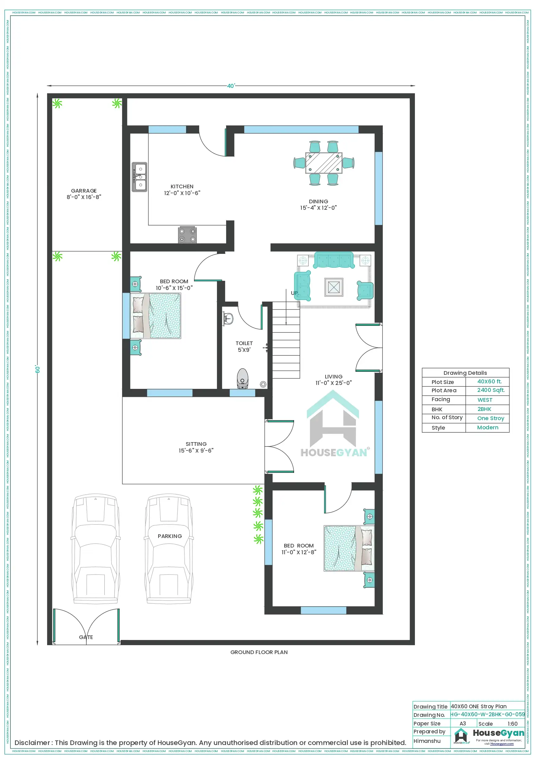 40X60 West Facing 2BHK Ground Floor House Plan | 2400 Sqft Plot Floor Plan
