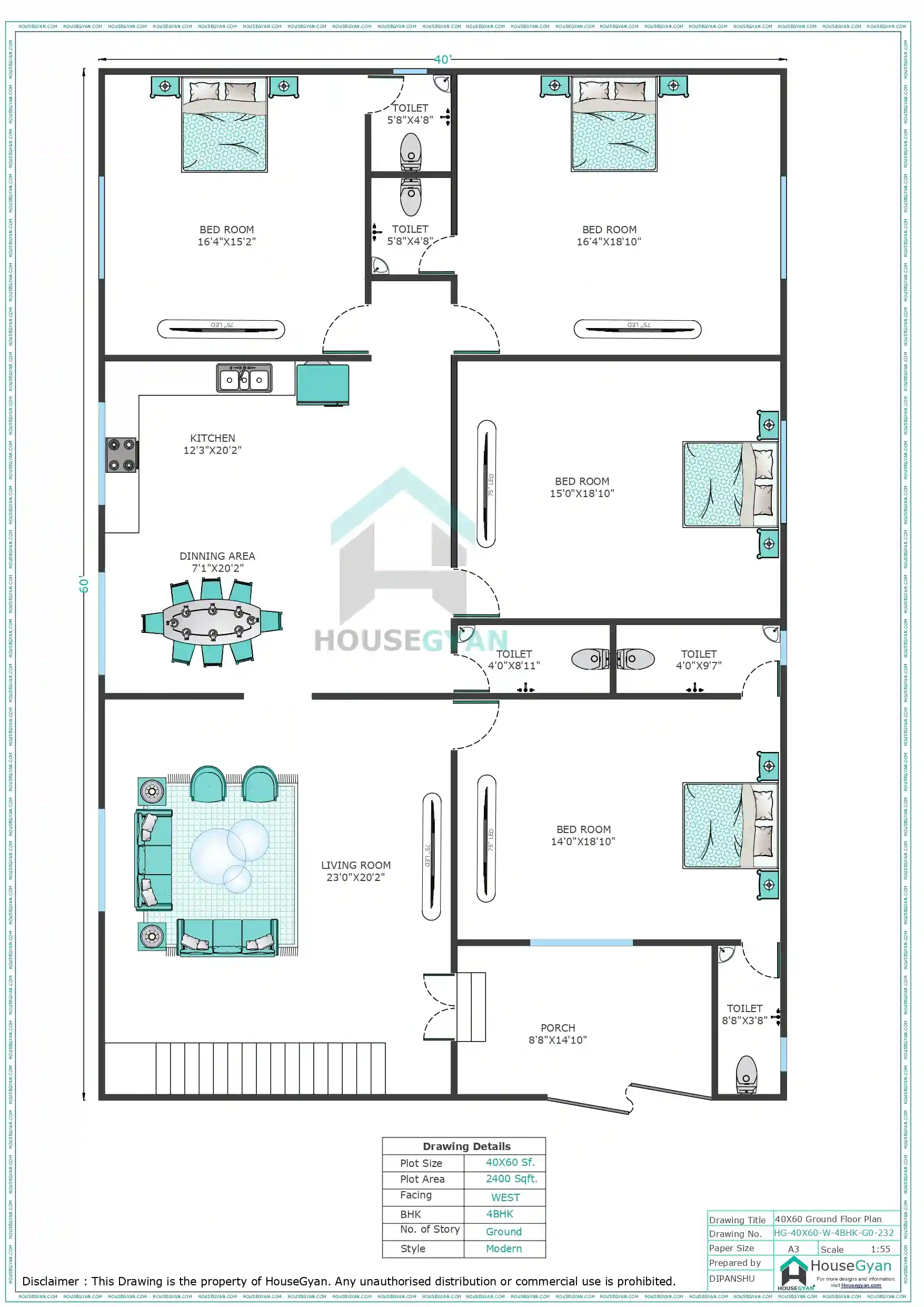 This 40X60 west-facing 4BHK ground floor house plan is designed to maximize space efficiently within a 2400 sqft plot. This house plan consists of 4 bedrooms, 1 Hall and 4 bathrooms within 2400 square feet. If you're looking for a 40X60 house plan, you've come to the right place. Here at HouseGyan architects, we specialize in designing and creating floor plans for all types of 40X60 plot size houses. Whether you're looking for a traditional multi stories home or a more modern ranch-style home, we can help you create the perfect 40*60 floor plan for your needs.